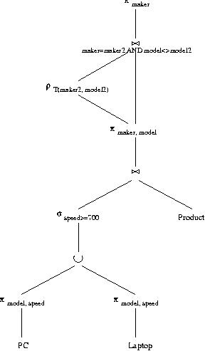 R2 = PI_{maker,model} (SIGMA_{speed>=700} (R1) JOIN Product)
